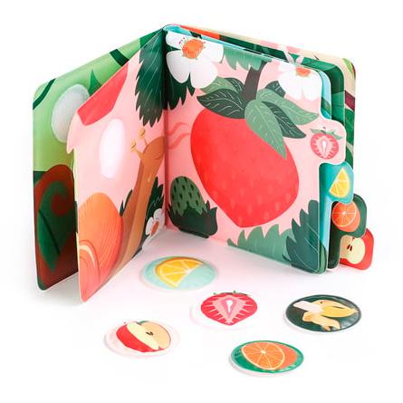 12 páginas ,5 animais ,5 aromas de frutas para descobrir .Combine 5 autocolantes perfumados com as frutas correspondentes. Plástico higiénico, fácil de limpar . A partir dos 12 meses.